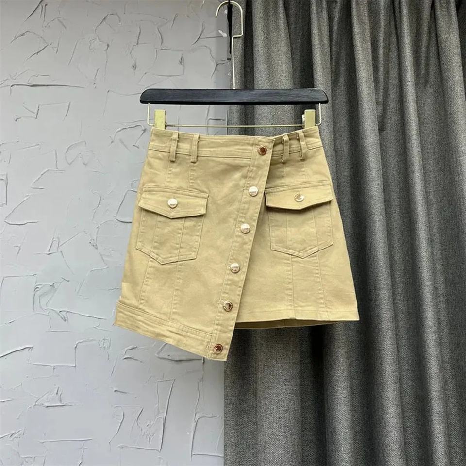 Green Fashion Denim Short Skirts Women Summer Y2K Chic Hot Girl Irregular Oblique Button High Waist Elasticity Jean Mini Skirt