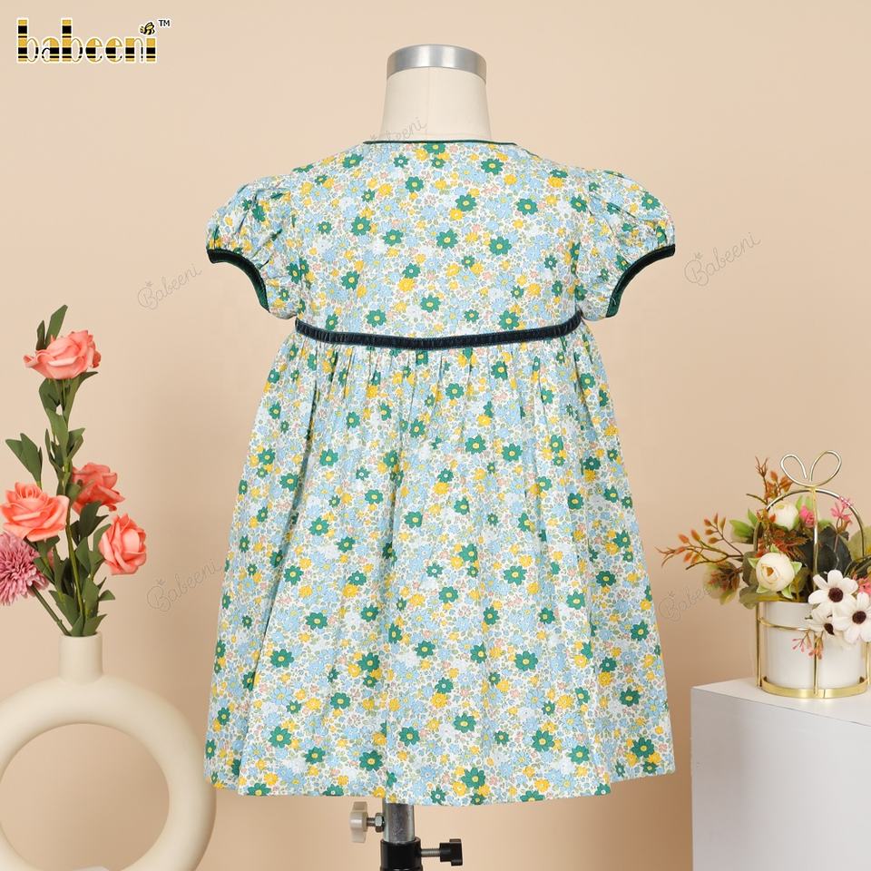 Green Floral Summer Middle Dress for Girls OEM ODM with Velvet Accent and Hand-Embroidered Floral Pattern-BB3344