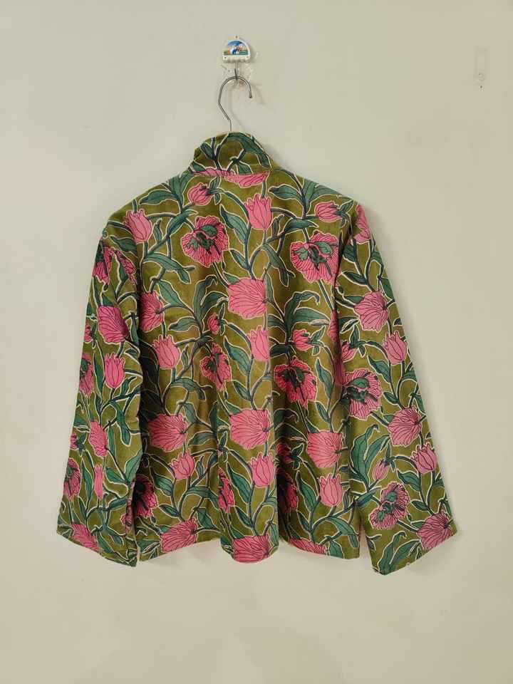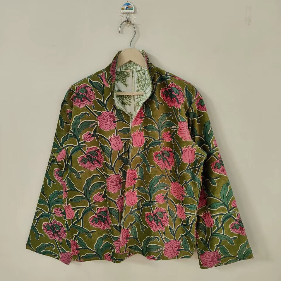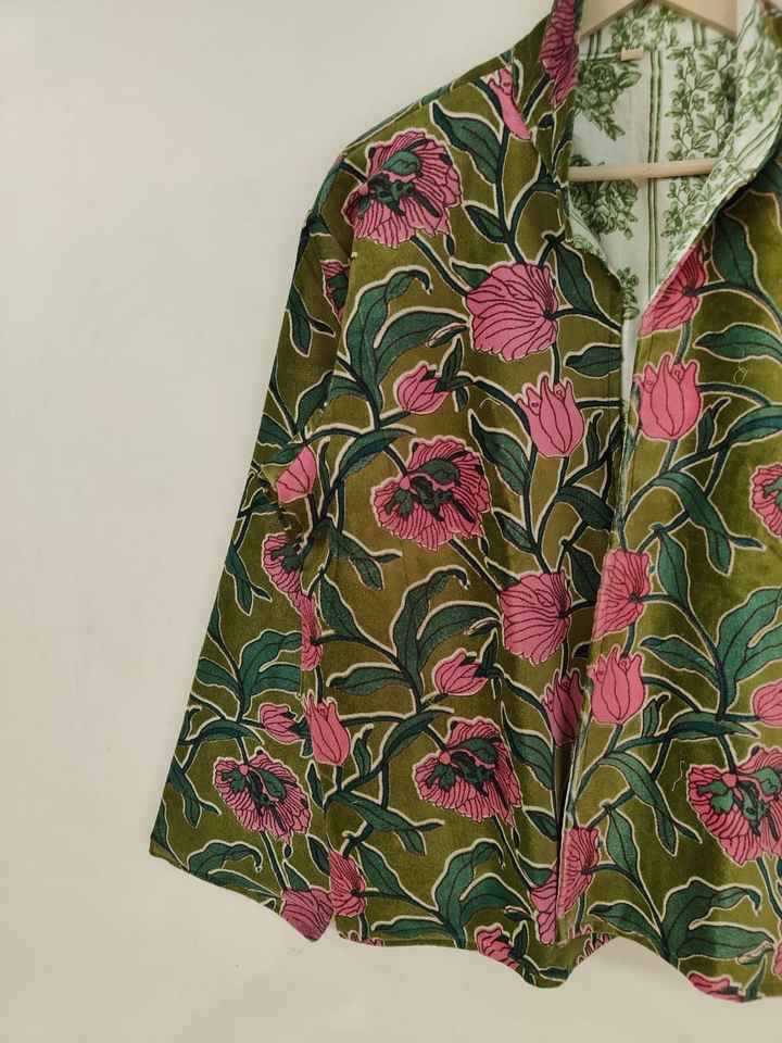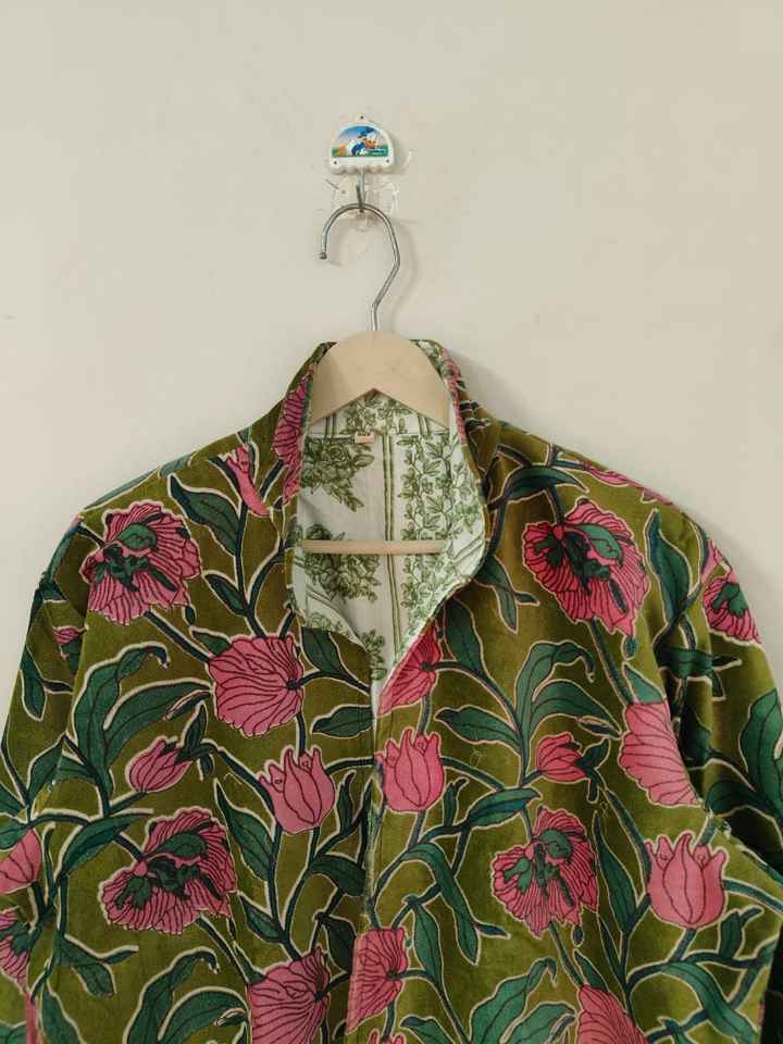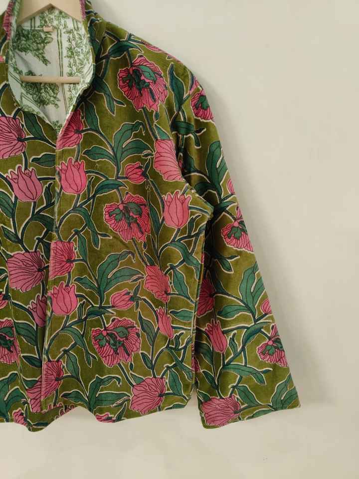 Green Floral Print Embroidered Velvet Bomber Jacket Reversible Eco-Friendly Short Length 100% Cotton Shell Winter Bohemian Style