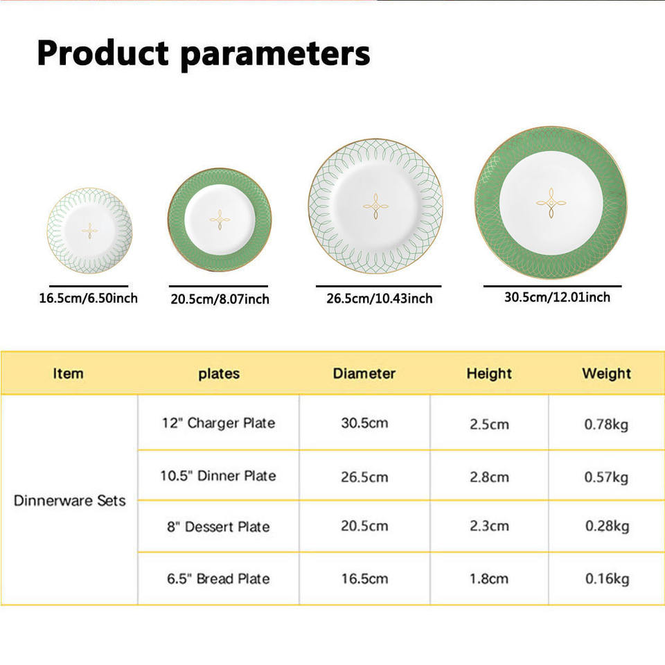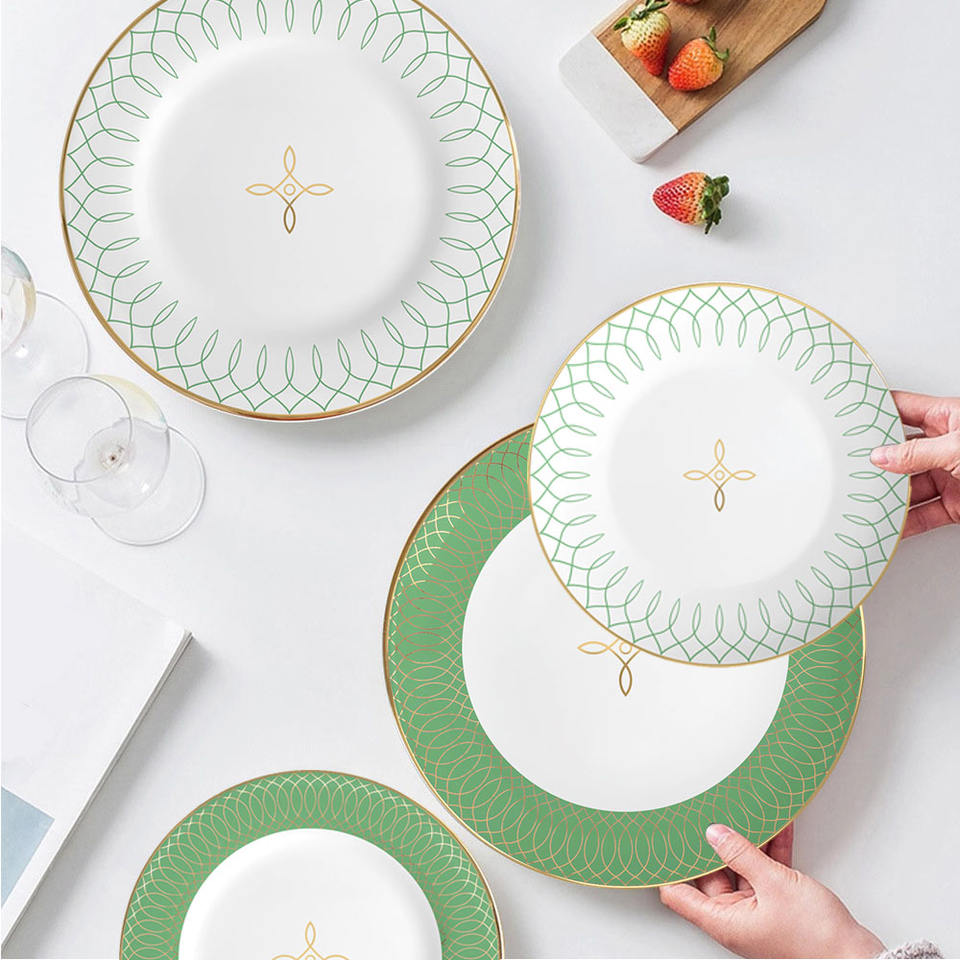 Green Golden Rim Plates Dinnerware Bone China Dinner Plate Western Eco-Friendly Tableware Sets with Packing Crockery