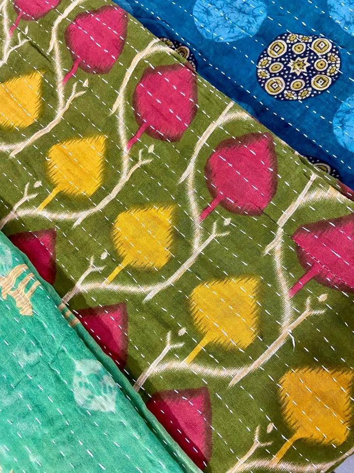 Green Handmade Kantha Quilt Reversible Cotton Sari Bedspread with Hand Stitched Kantha Throw for Hotel Use