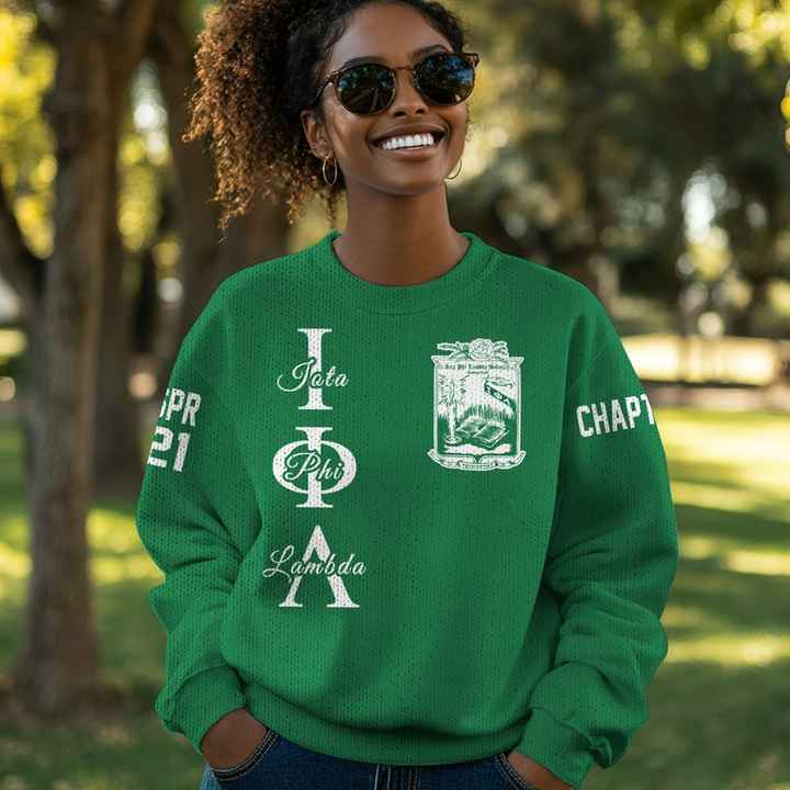Green Iota Phi Lambda Varsity Jacket Knitted Sweater Personalized with Chapter and Crest for Iota Phi Lambda Sorority Members.