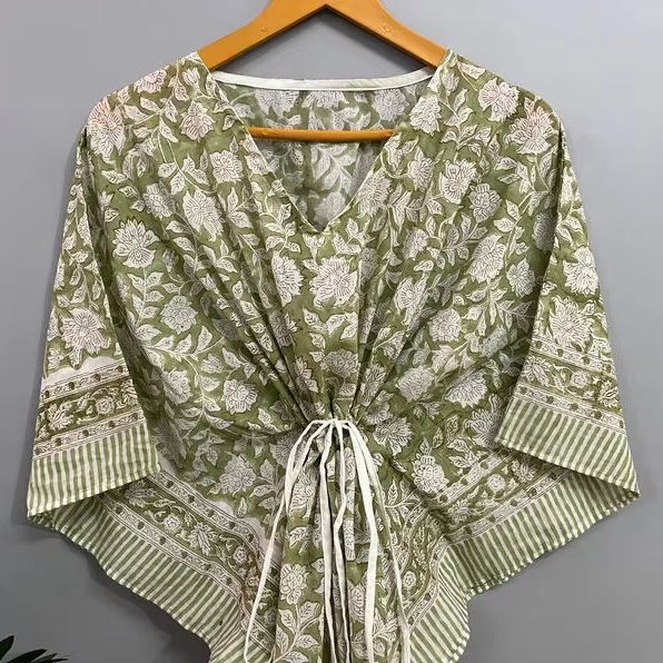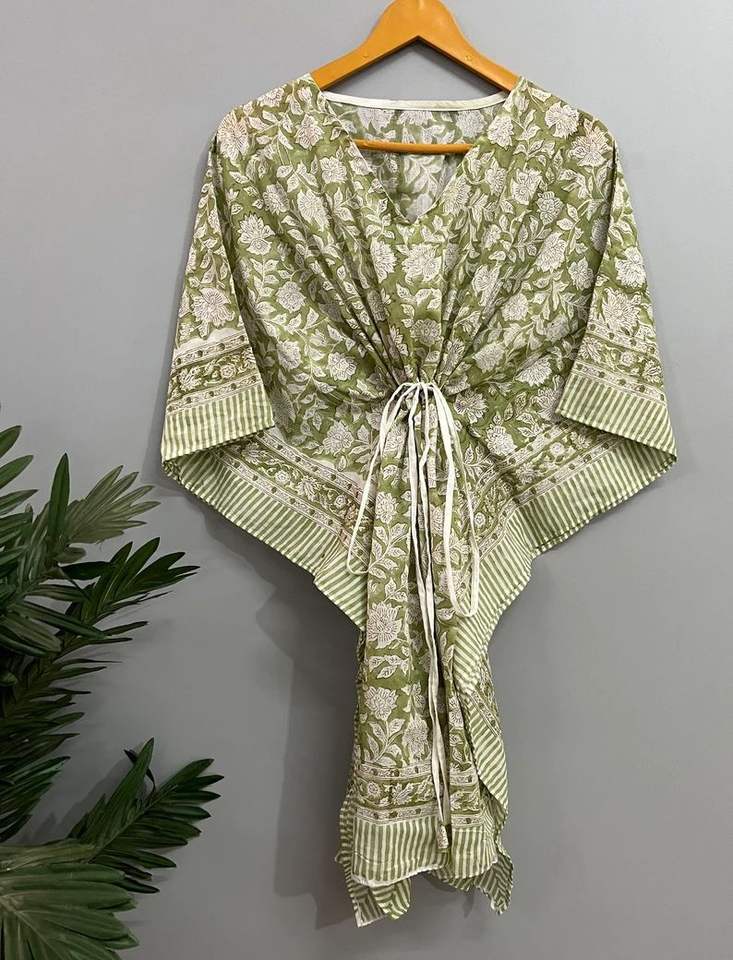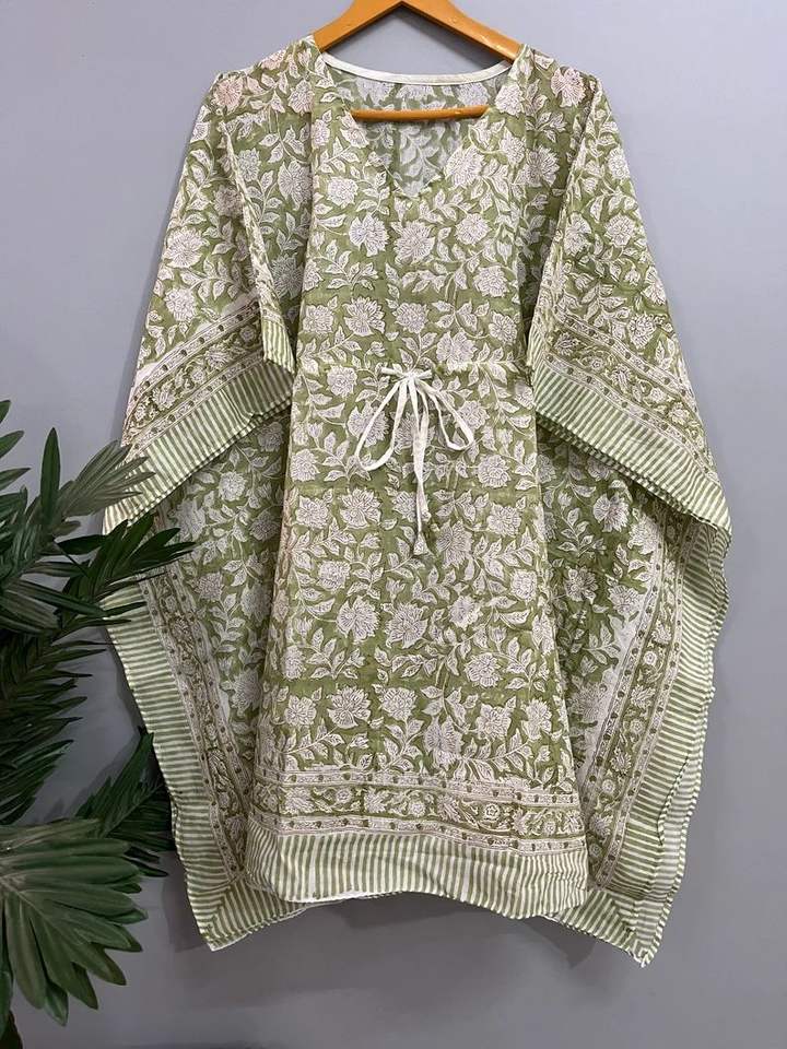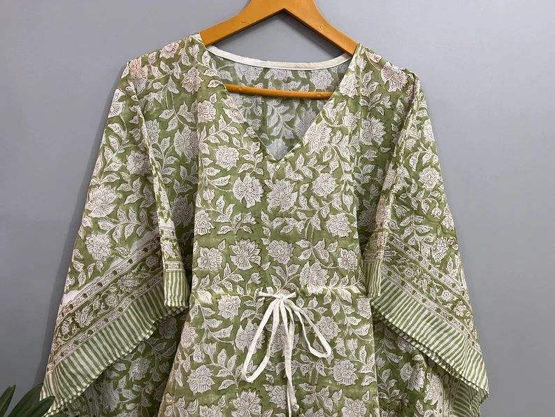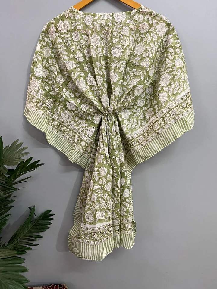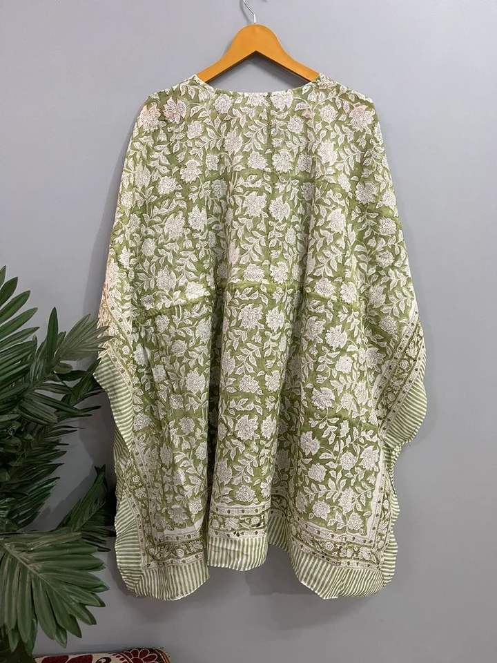 100% Cotton Maxi Dress Green Leaf Flower Block Print Kaftan Natural Long Top Cover Ups for Casual Parties Beach Dancers
