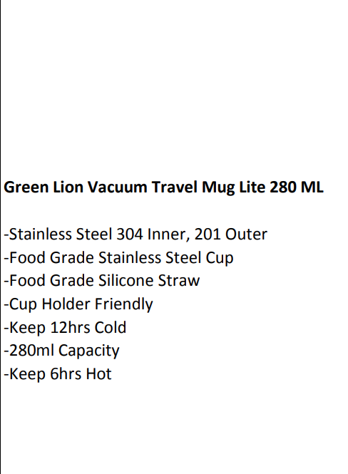 Green Lion 280ml Vacuum Travel Mug Glass Bottle Coffee Drinks Lite 200ml Capacity Plastic Paper Material Drinkware Water Bottle