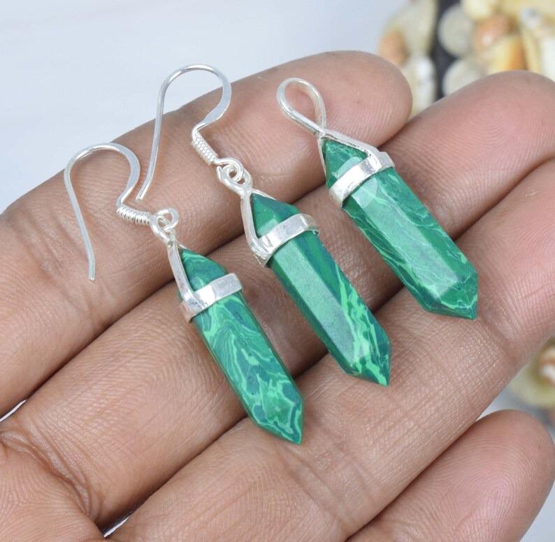 Green Malachite 925 Sterling Silver Gemstone Hook Earrings Pendant Set Elegant Handmade Jewelry Gift for Her 2 Stone Earring