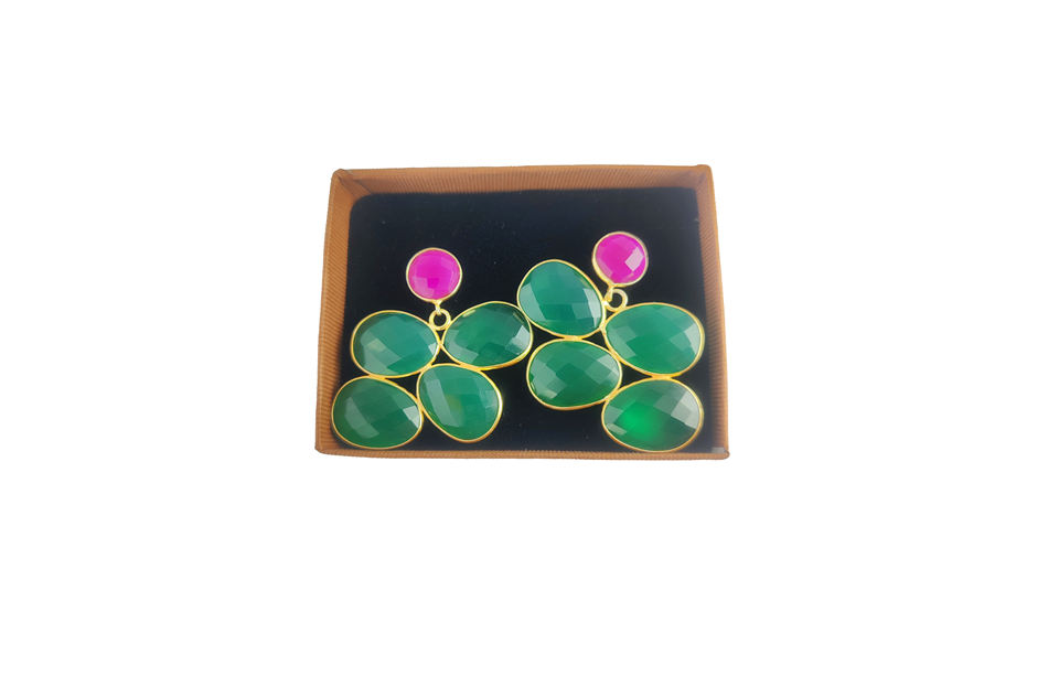 Green Onyx & Hot Pink Chalcedony Earrings 18k Gold Plated 925 Silver & Brass Jewelry with Diamond Charm Gift for Her