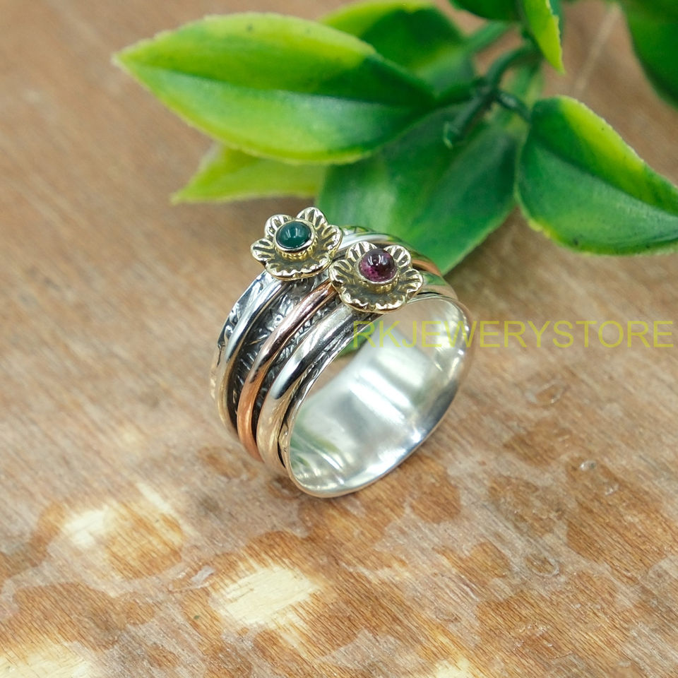 Green Onyx and Red Garnet Spinner Ring Thumb Ring 925 Sterling Silver Handmade Hammered Ring With Brass And Copper Jewelry