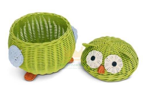 Green Owl Decorative Storage Basket with Lid Hand Woven Rattan Shelf Organizer Cute Handmade Home Decor