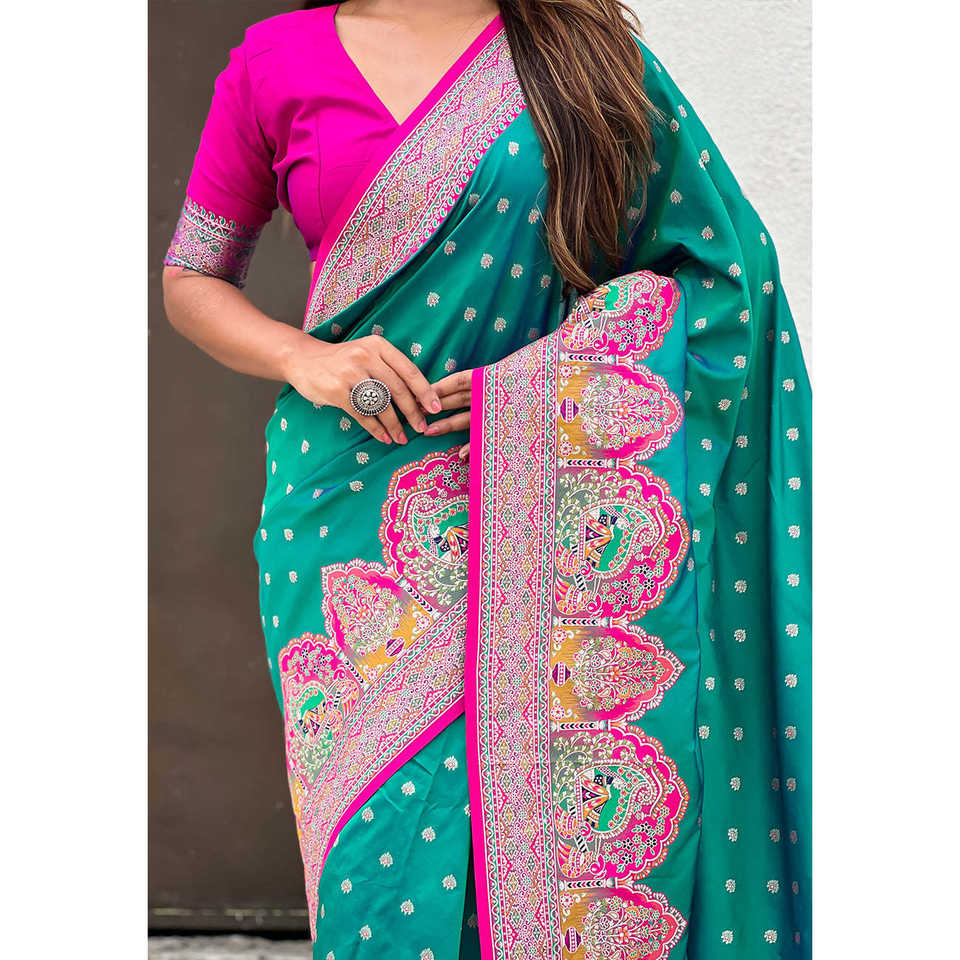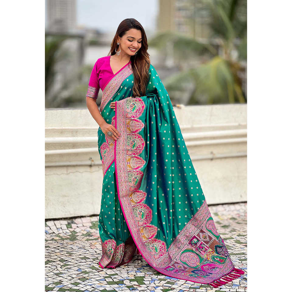 Green Pashmina Darbari Silk Saree with Zari Woven Indian & Pakistani Clothing