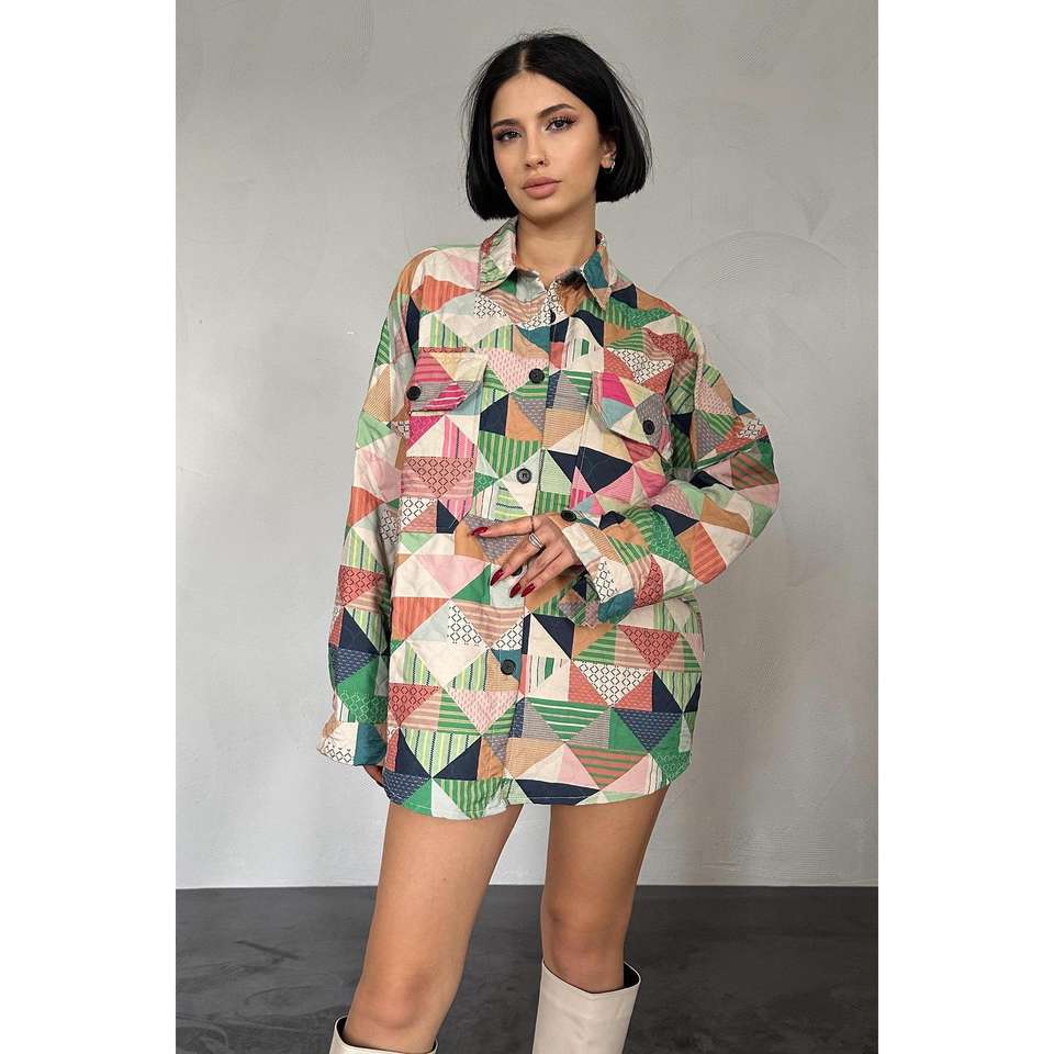 Green Patchwork Quilted Shirt Women Casual Button Down Poplin Blouse Everyday Style