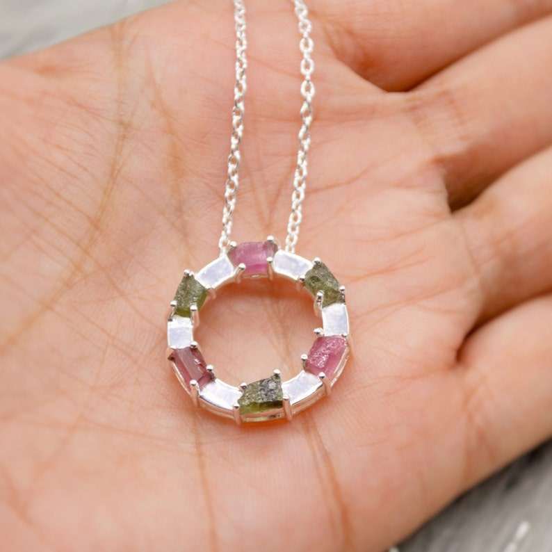Green Pink Tourmaline Necklace Sterling Silver October Birthstone Pendant Gemstone Chain Necklace for Women