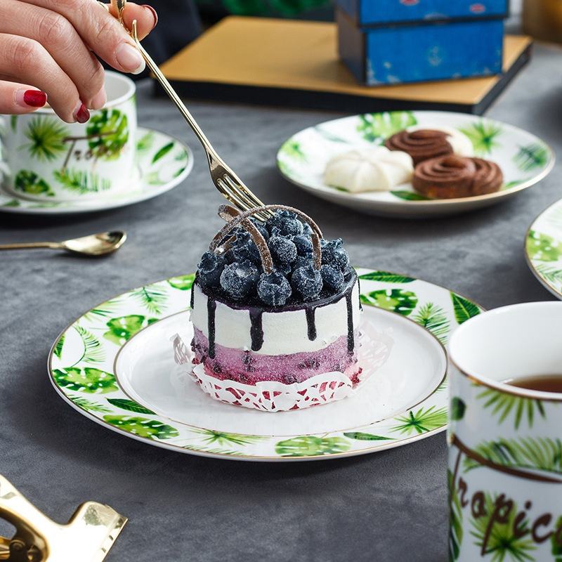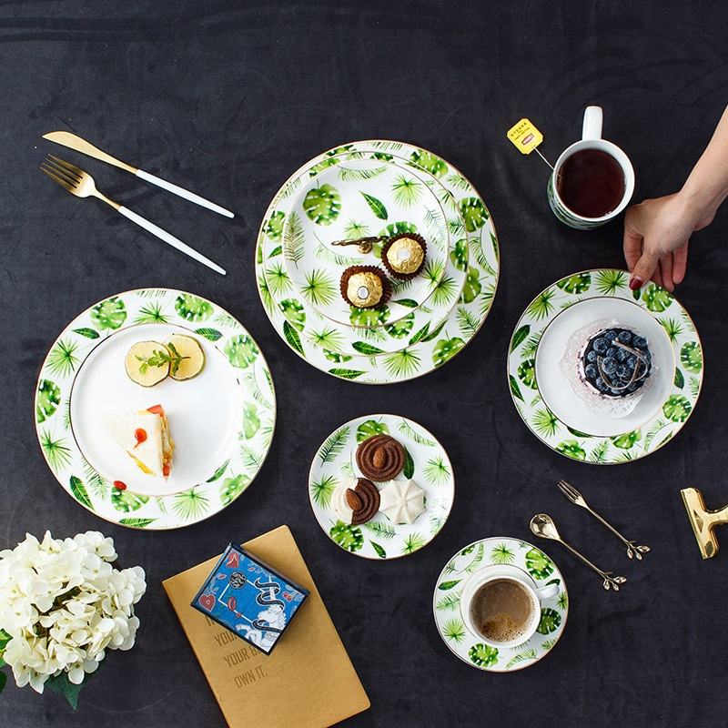 Green Plant Design Bone China Ceramic Dinner Plate Cup Saucer Mug Cutlery Set