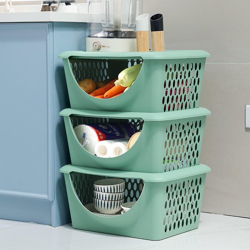Green Rectangle Kitchen Storage Basket With Handle For Fruit Vegetable Organizing Large Size Plastic Stackable Container