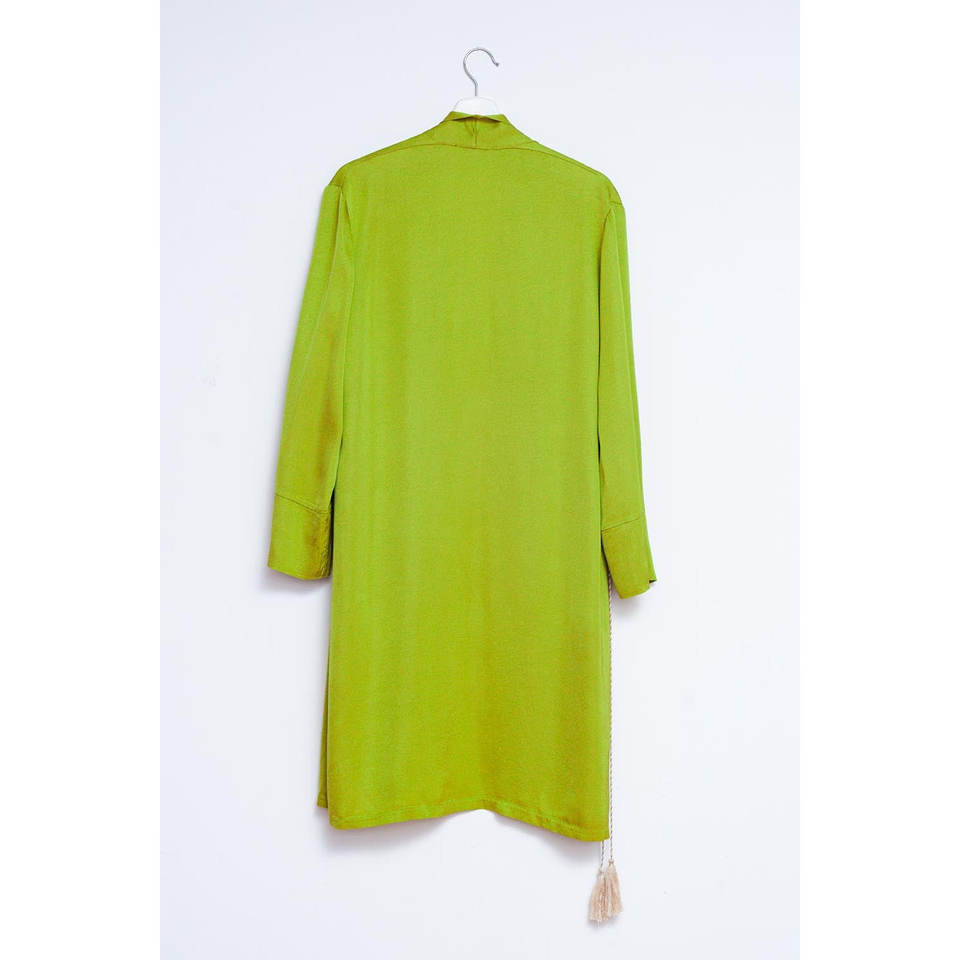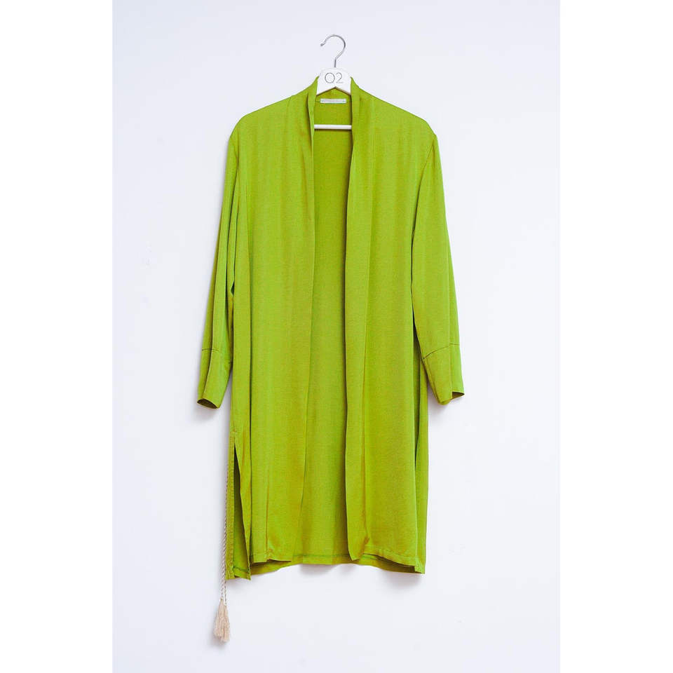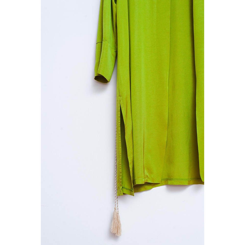 Women's Green 100% Silk Relaxed Fit Long Sleeve Kimono with Tassel Decoration for Outerwear