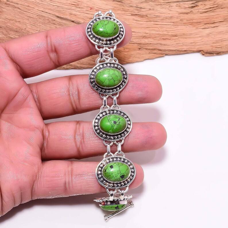 Green Turquoise Bracelet Silver Boho Toggle Clasp Handmade Gemstone Jewelry Statement Bracelet Gift For Her