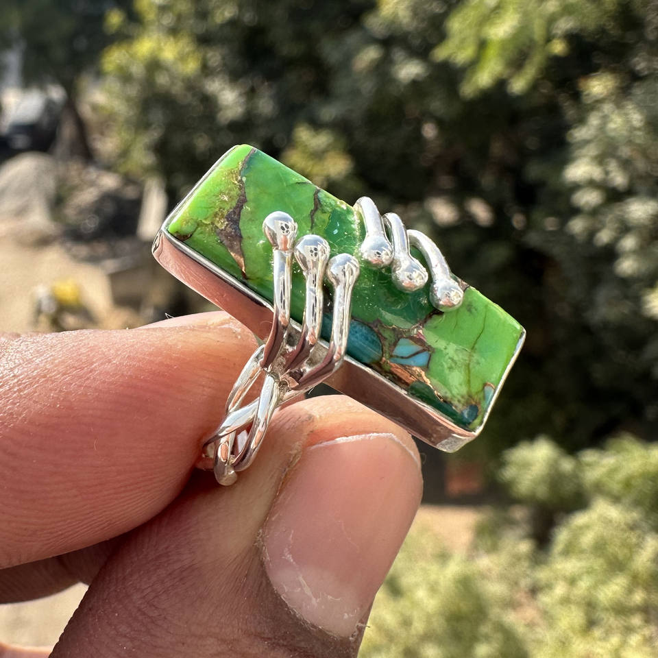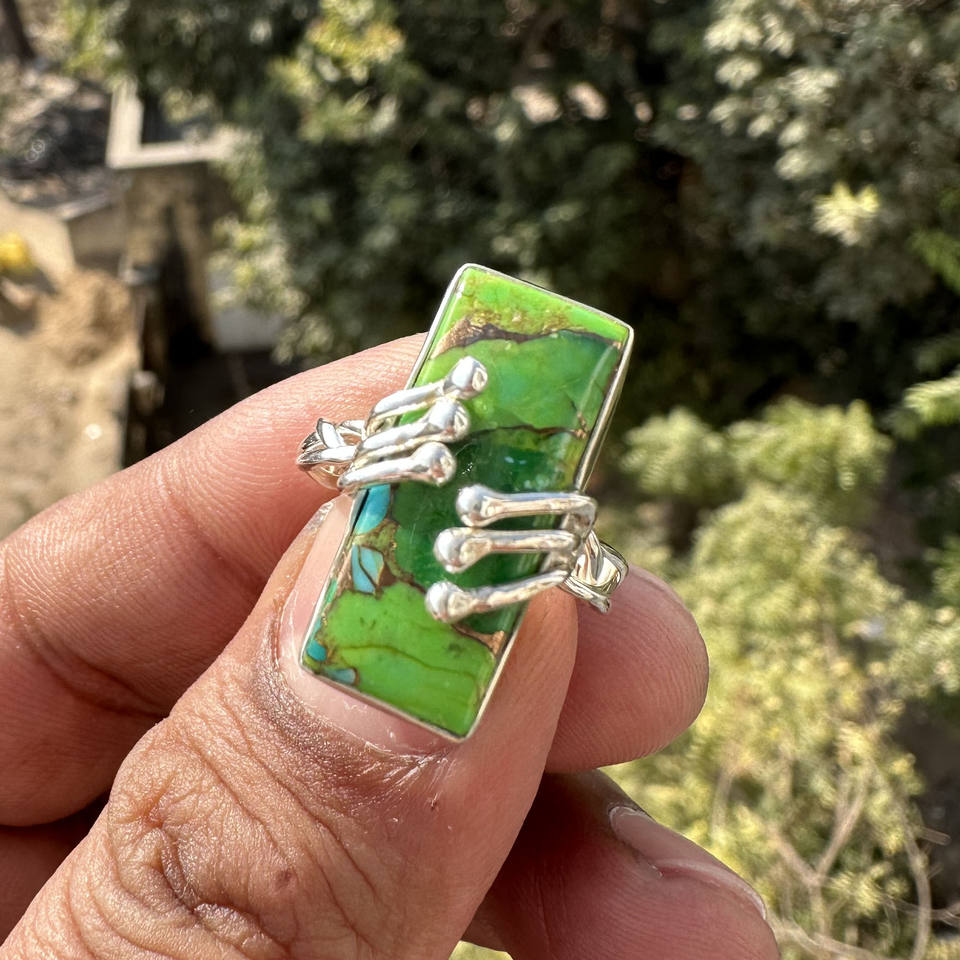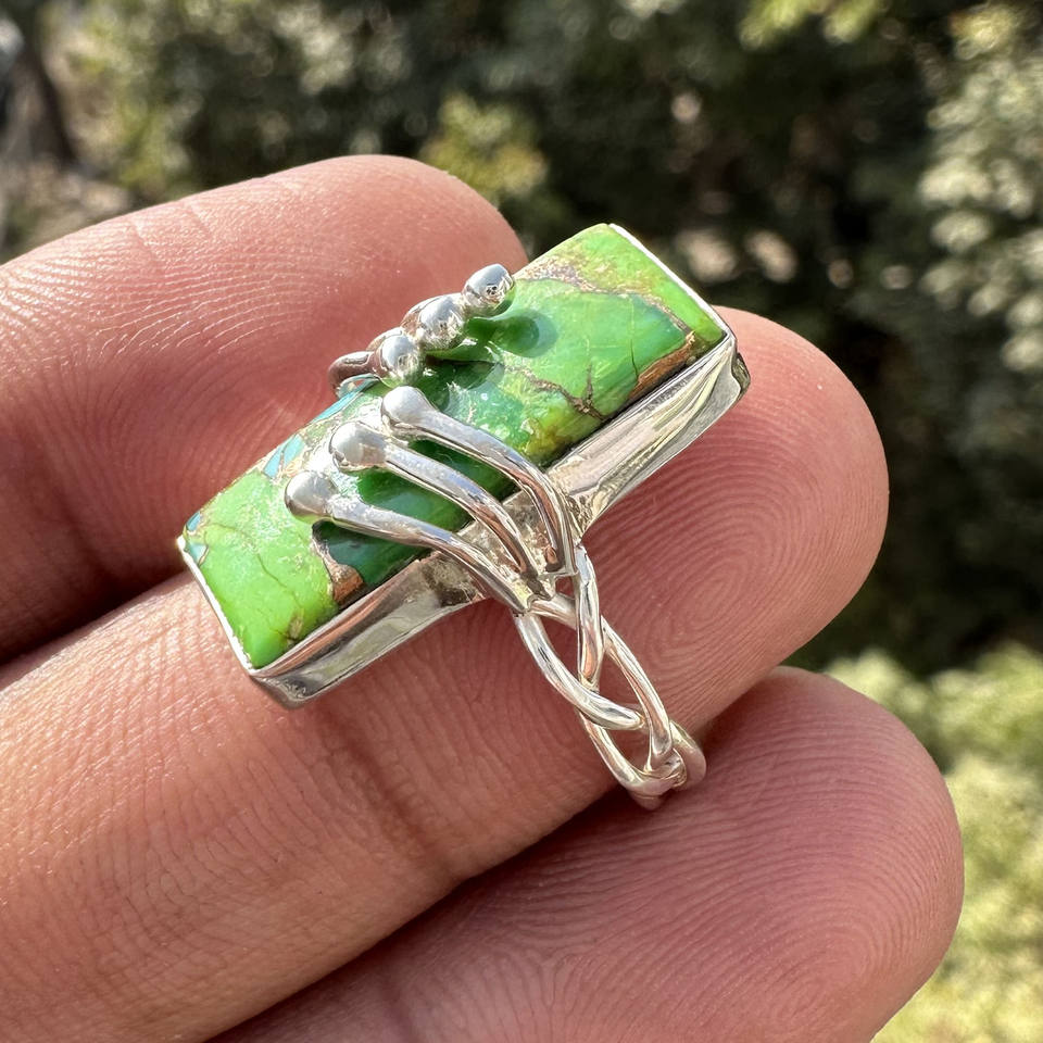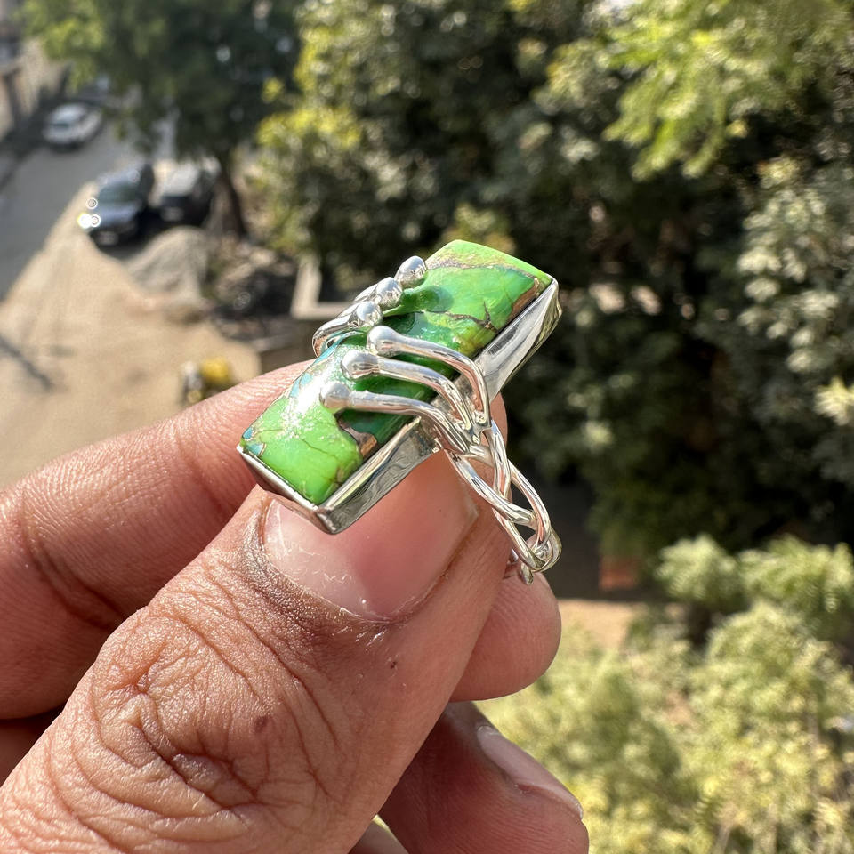 Green Turquoise Gemstone Ring with Bezel Setting Handmade Sterling Silver Bohemian Style Rectangle Shape Jewelry for Women