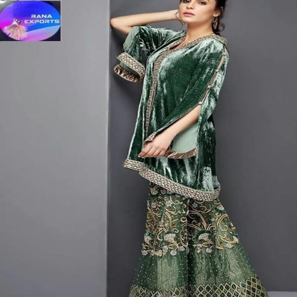 Green Velvet Kurti with Heavy Embroidered Sharara Set for Women Traditional Ethnic Party Wear Dress Wholesale Premium Quality