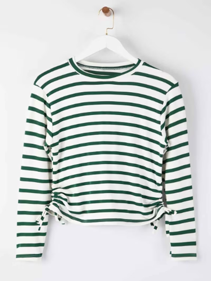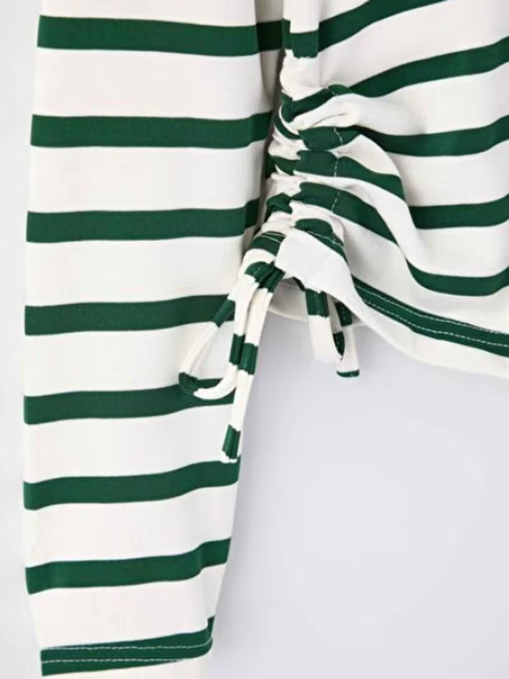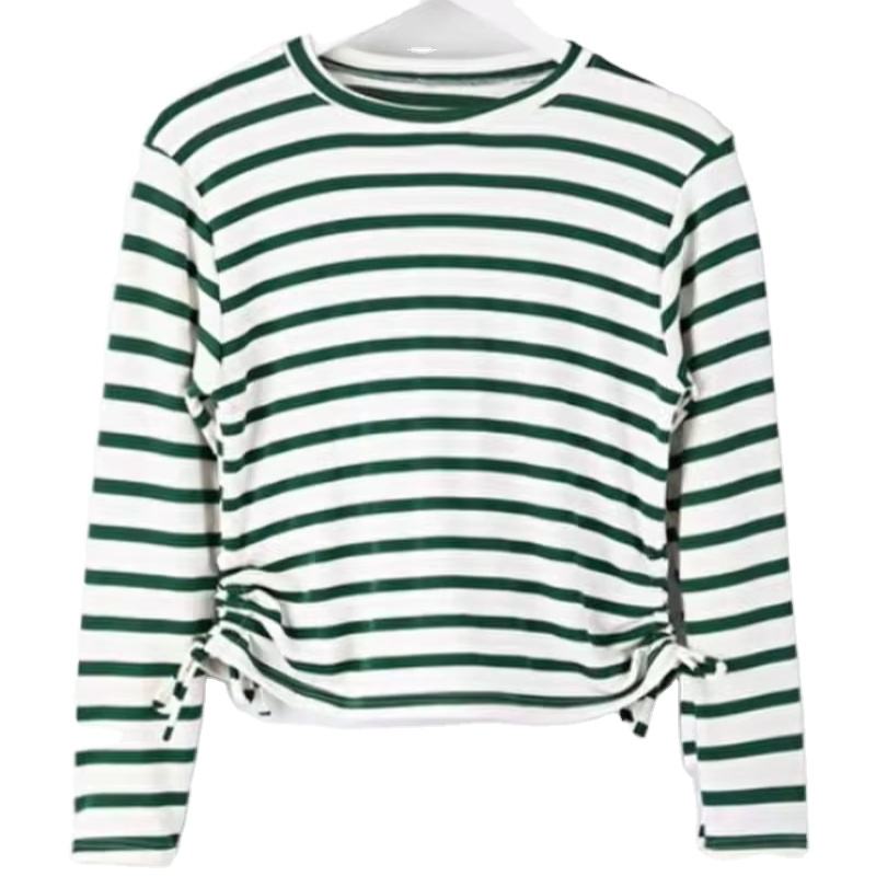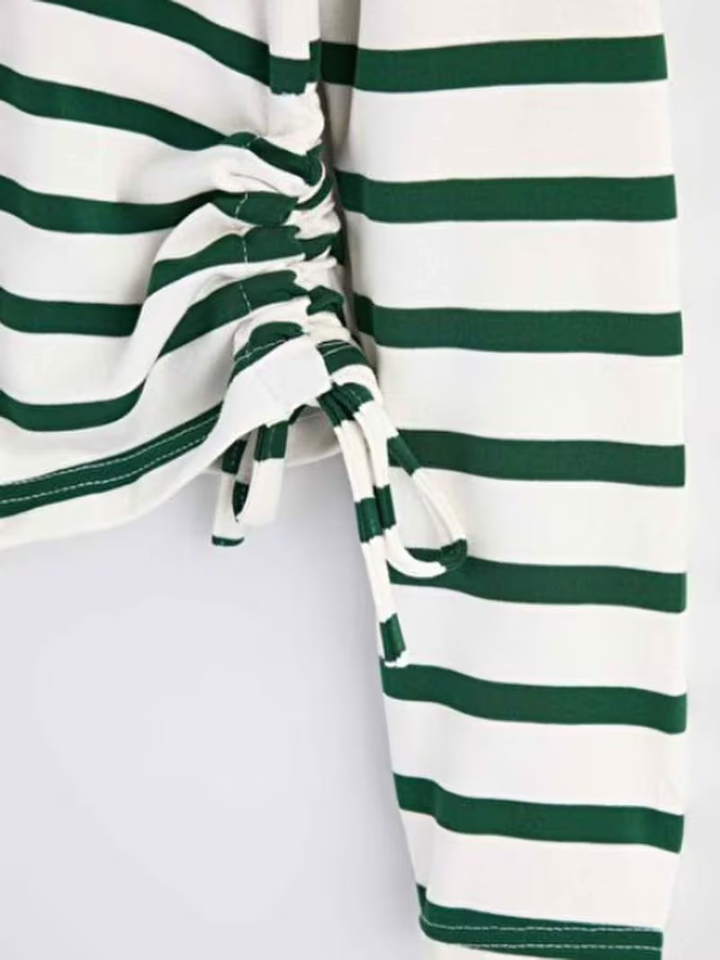 Green and White Striped Girls Long Sleeve T-Shirt Crew Neck Regular Fit Drawstring Hem Soft Breathable Fabric Casual Bangladesh