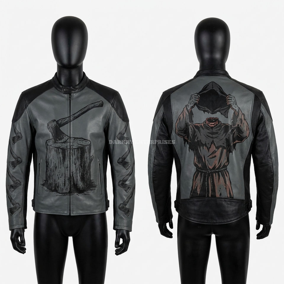 Grey Black Leather Racing Jacket Headless Monk Graphic Axe Print Gothic Streetwear Biker Outerwear Custom Manufacturer Direct