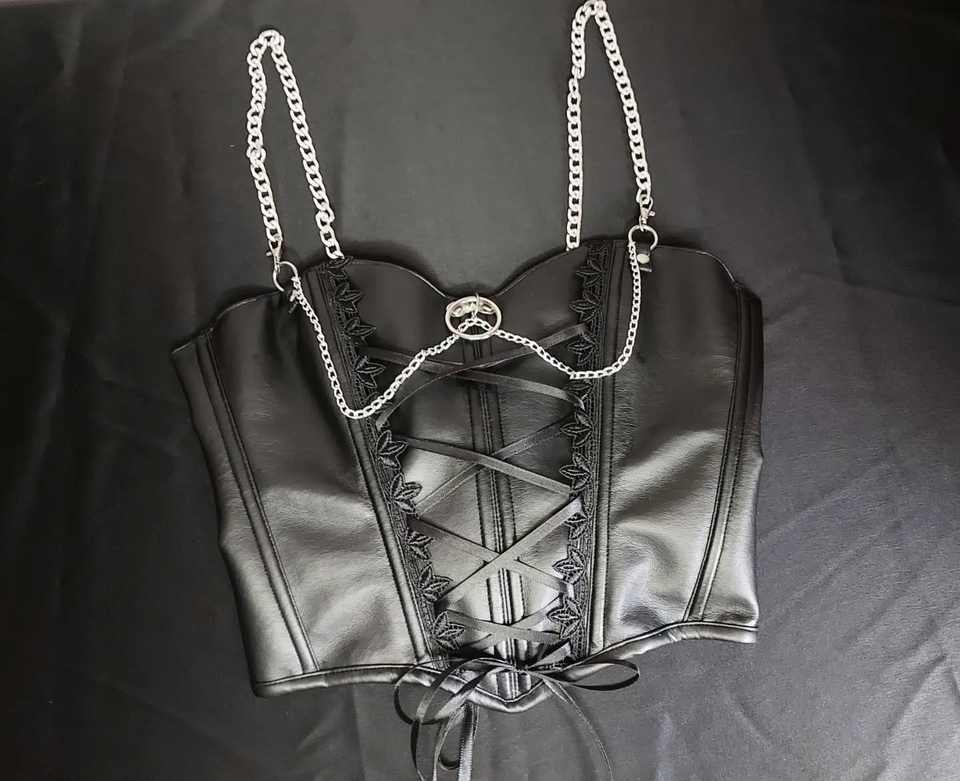 Grey Faux Leather Corset for Women Sexy Bustier Top with Chain style on shoulder Closure Partywear Waist Cincher Gothic Fashion
