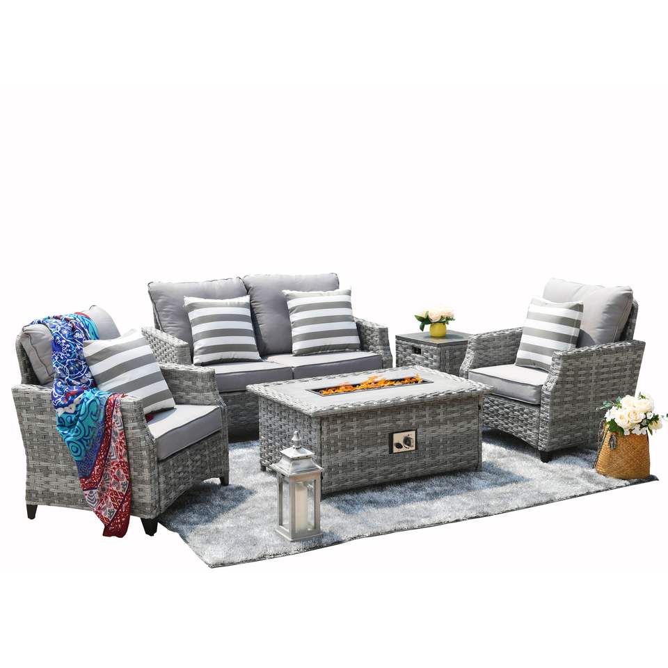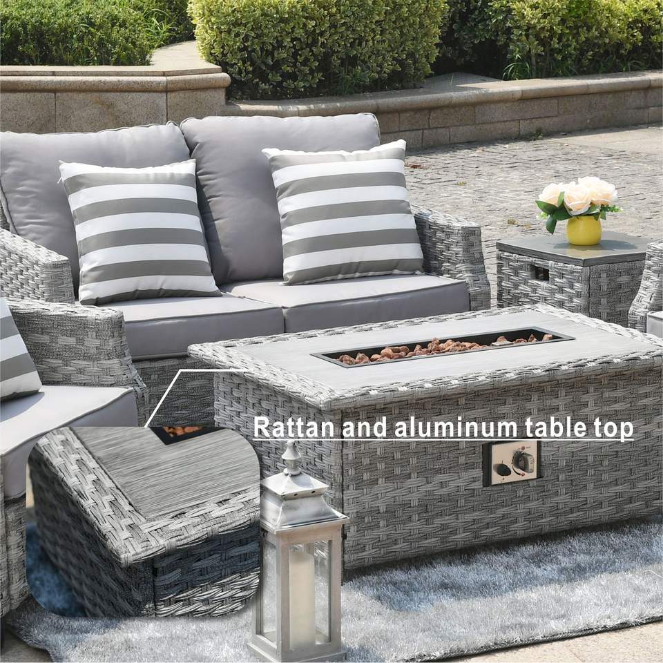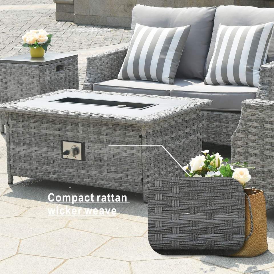 Grey Fire Pit Table with Rattan Wicker Sofa Chair Set Outdoor Garden Furniture