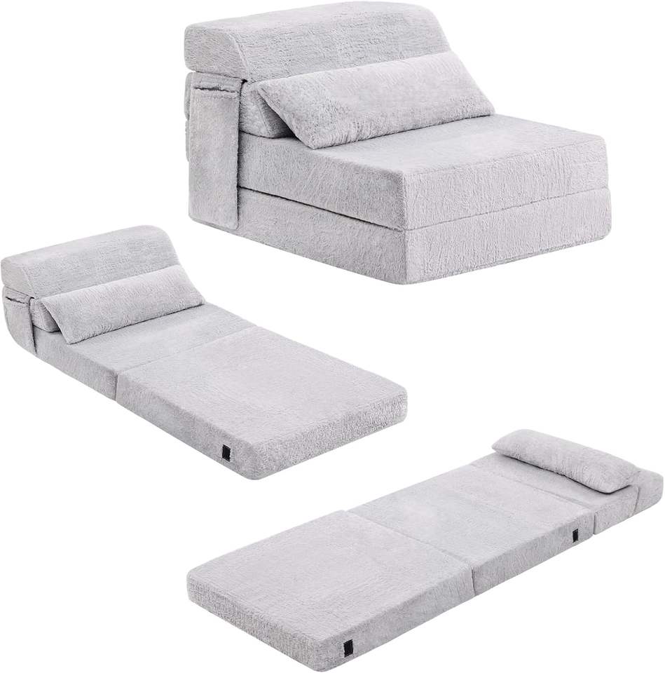 Grey Folding Sofa Bed Pillow Single Size Mattress Plush Fabric with Portable Storage Bag Floor Lounger Chair Bed Living Room