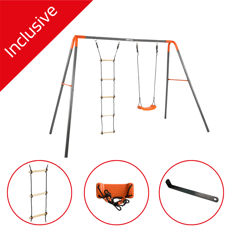 Grey Orange KETTLER Double Swing COMBI Outdoor Set Swing Frame Seat Ladder Ground Anchors 100kg per Element 50kg Load