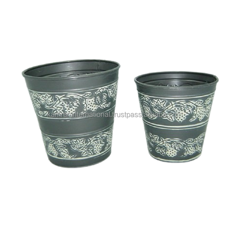 Grey Rustic Vineyard Embossed Metal Flower Pots (Set 2) Farmhouse Garden Decor Outdoor Indoor Planter Drainage Hole Eco-Friendly