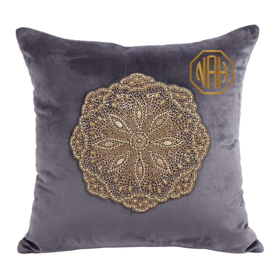 Grey Velvet Beaded Cushion Cover Handmade Embroidered Luxury Pillow Case Decorative Sofa Factory Custom Export Wholesale Supply