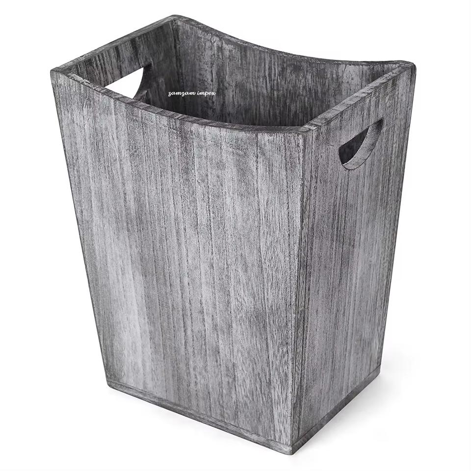 Grey Washed Rustic Farmhouse Wood Wastebasket Bin with Handle Style Wooden Trash Can for Bathroom, Bedroom, or Office Decor