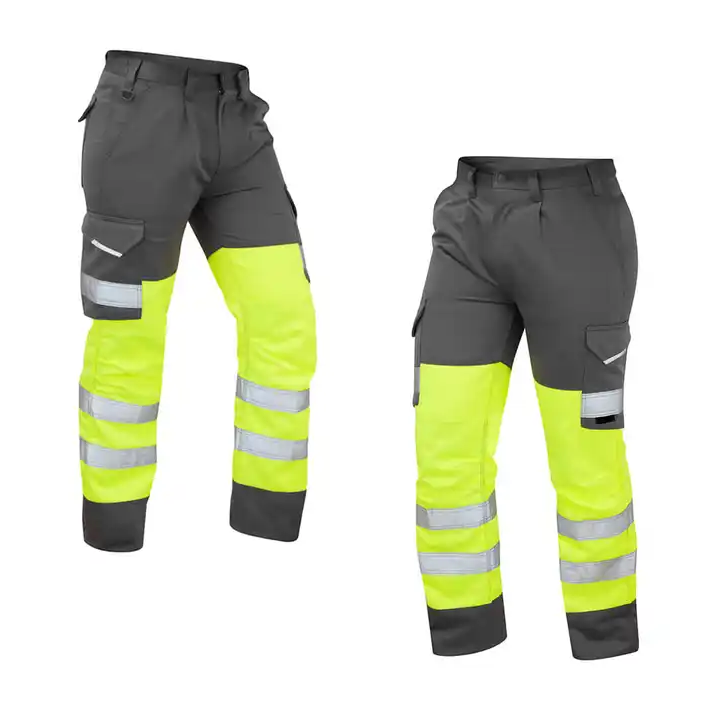 Grey Yellow Reflective Cargo Work Pants Hi Vis Industrial Safety Trousers Durable Polyester Cotton Workwear
