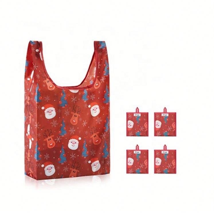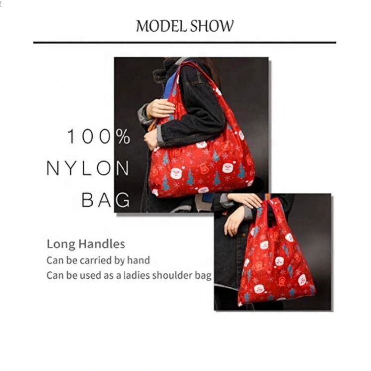 Grocery Customized Logo Letter Pattern Long Handle Polyester Foldable Reusable Tote Shopping Bag Printing for Christmas Party