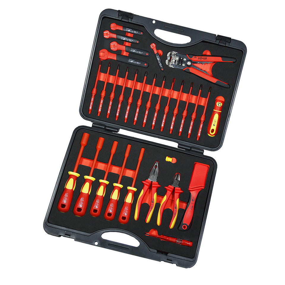 Stripper, Interchangeable Handle, Precision Screwdriver Cap, 110-250V Voltage Tester, VDE Cable Knife, 6" VDE Diagonal Plier, 7" VDE Combination Plier, VDE Interchangeable Blades, VDE Spanners, VDE Nutdrivers