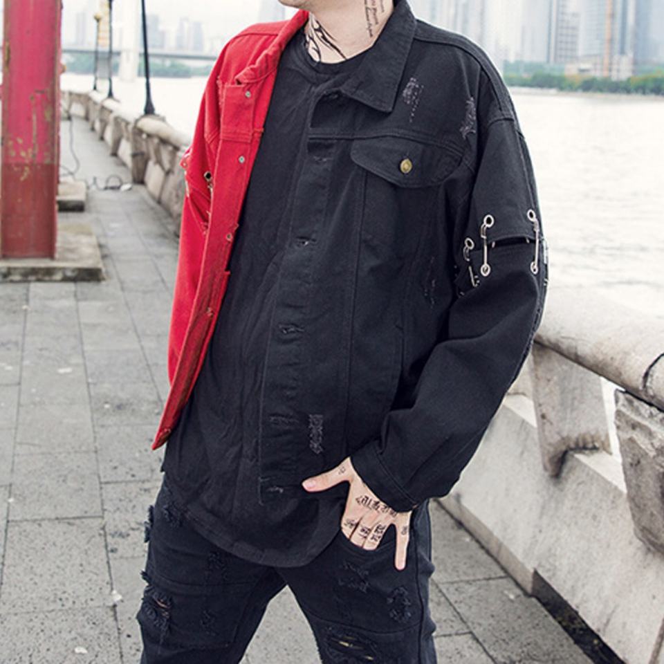 Guangzhou Fashion Jacket Custom Design Men's Distressed Denim Outwear Black Red Ripped Coat Motor Bike Jacket