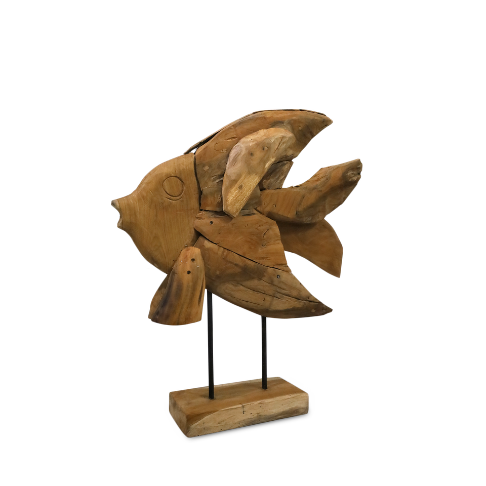 Gubuk Bali Teak Root Handmade Traditional Rectangle Big Fish Statue with Iron Stand Floor Mount for Home Office Outdoor