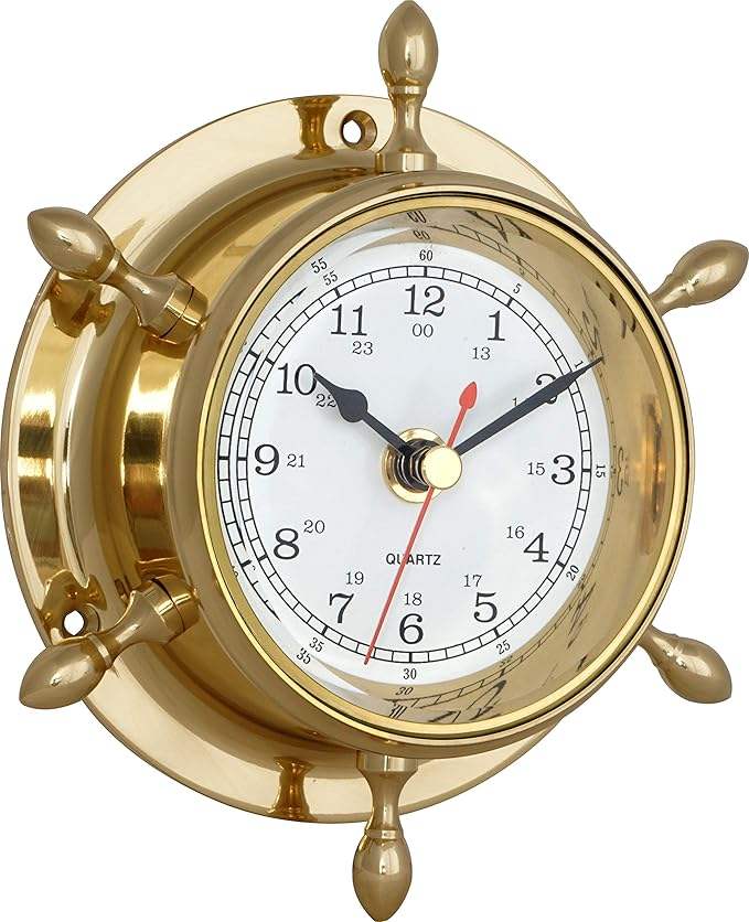 H.M.A Handicrafts Nautical Brass Ship Wheel Wall Clock Vintage Maritime Quartz Timepiece for Home Office or Cabin Decor