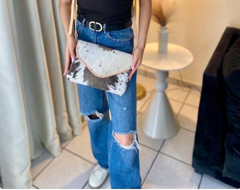 Handmade Women's Lady Fashion Tote Bag Cowhide Crossbody Purse in Brown White Genuine Leather Stylish Durable Zipper Closure