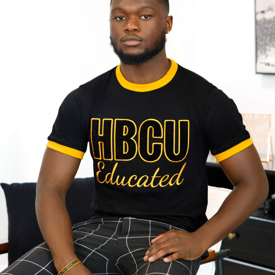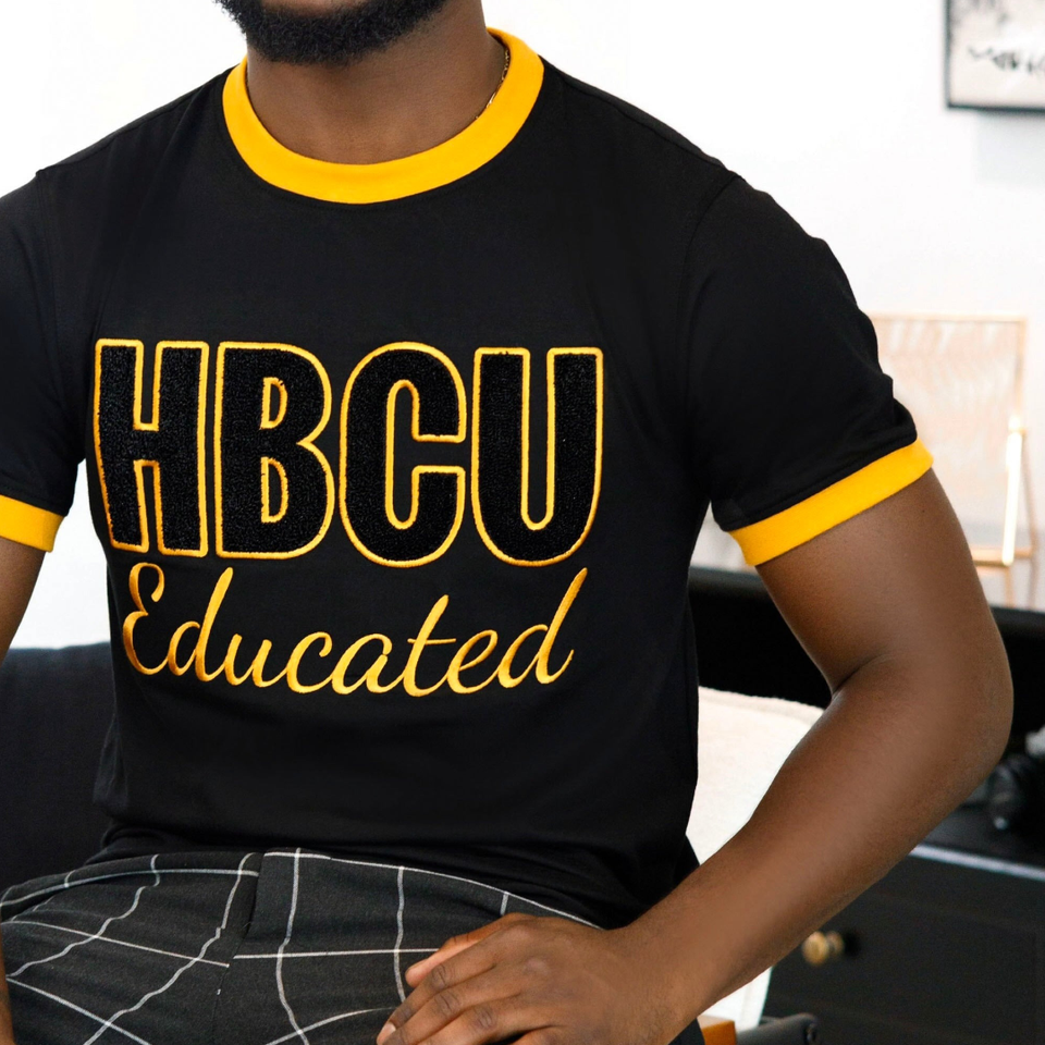 HBCU Educated Chenille Tee Black Gold Trim Greek Life Apparel Collegiate Pride Men Cotton Ringer Shirt Custom Wholesale
