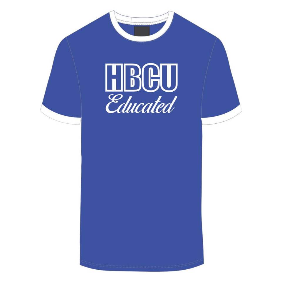 HBCU Educated Men Chenille Contrast Trim Ringer T Shirt Blue with White Embroidered Letters Soft Cotton Collegiate Apparel