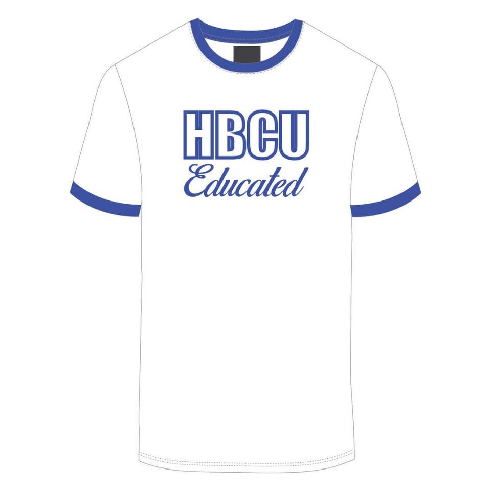 HBCU Educated Men Chenille Contrast Trim Ringer T Shirt White with Blue Embroidered Letters Soft Cotton Collegiate Apparel