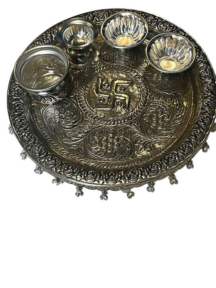 HF INDUSTRIES High Quality German Silver Combo Pooja Thali Set Wedding Festival Microwave Safe Traditional Style Cup Included