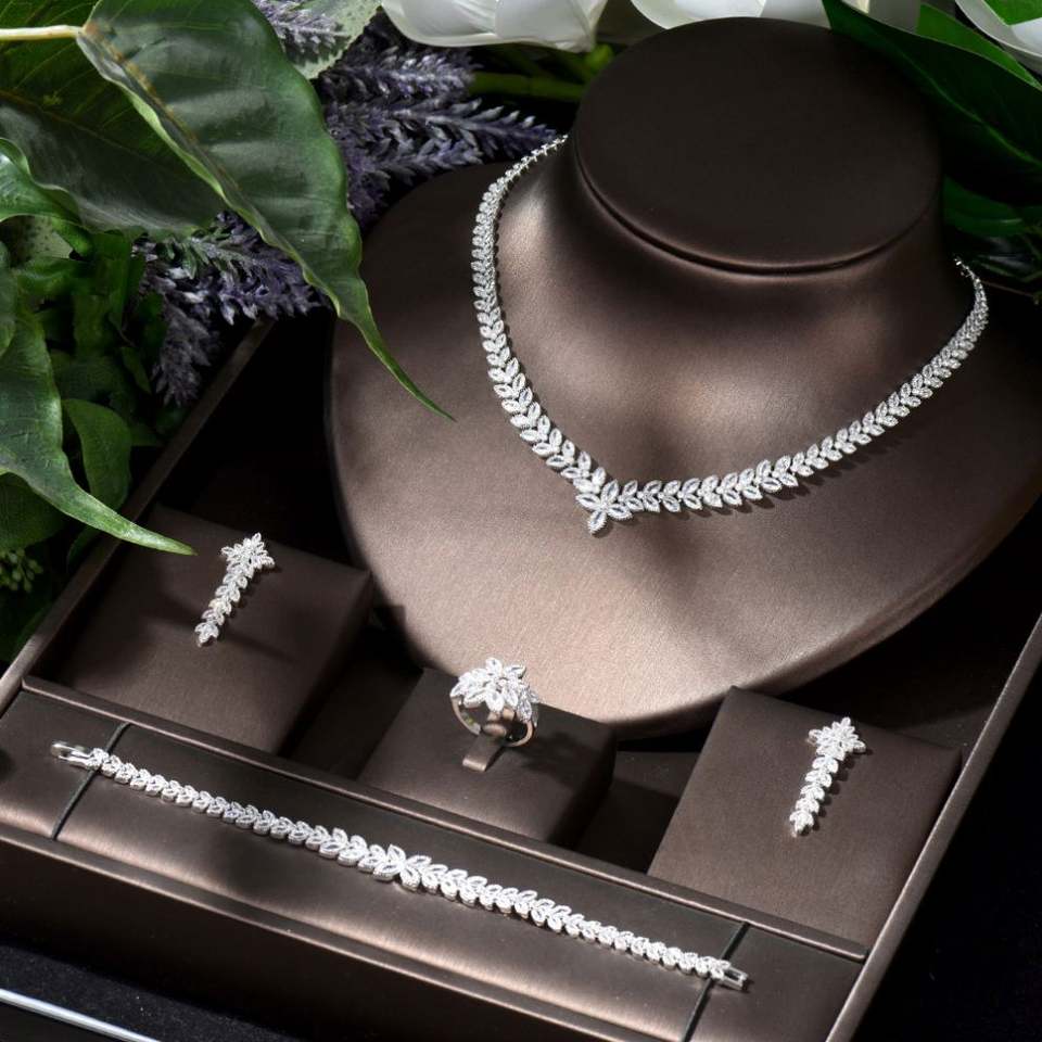 HIBRIDE Graceful Leaf Shape CZ Jewelry Set Bride Women Necklace Earring Ring and Bracelet 4PCS Set Formal Occasion Bijoux N-1268