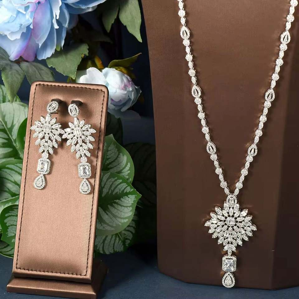 HIBRIDE Long Zirconia Wedding Jewelry Sets Water Drop 3pcs Necklace Earring Ring Set for Women Anniversary Party Show N-1232