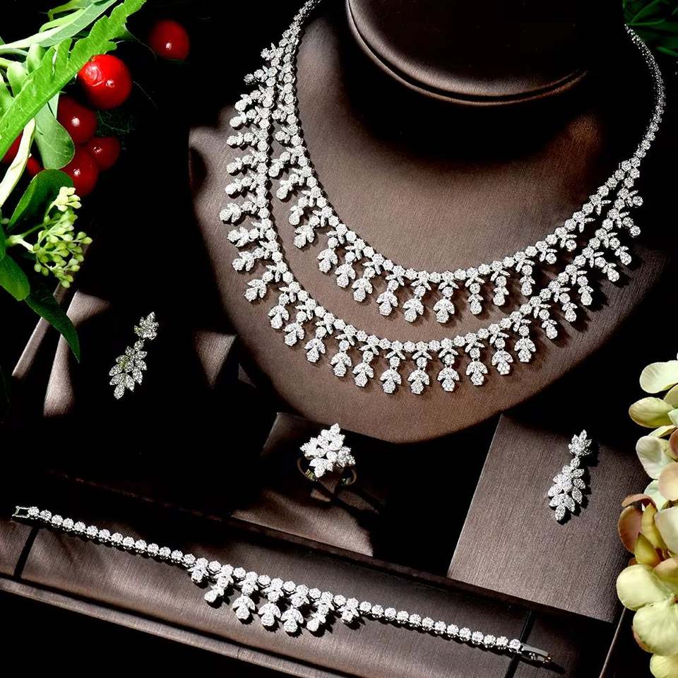 HIBRIDE Luxury 2 Layers Lady Bridal Engagement Wedding Necklace Earrings Ring and Bracelet Set Shiny Zircon Collier Femme N-367