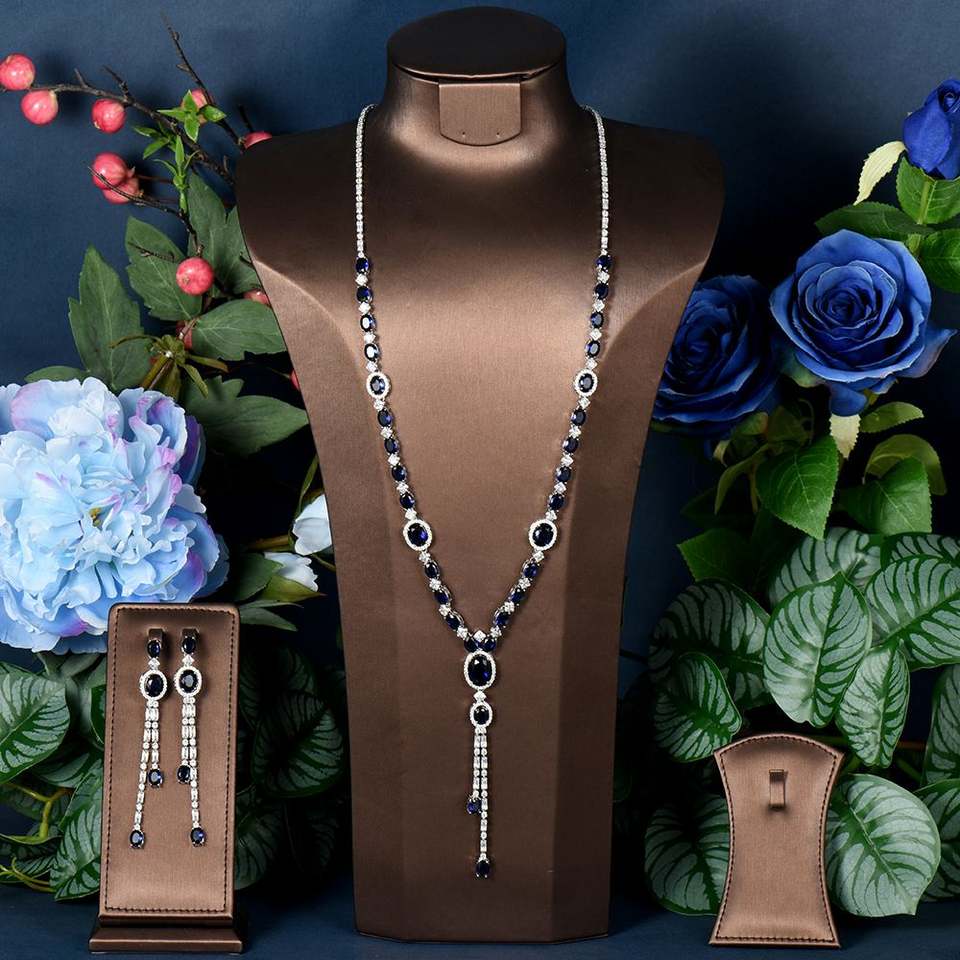 HIBRIDE Luxury Blue 2 Piece Long Necklace and Earring AAA Cubic Zircon Jewelry Sets Women Wedding European Party Jewelry N-1328
