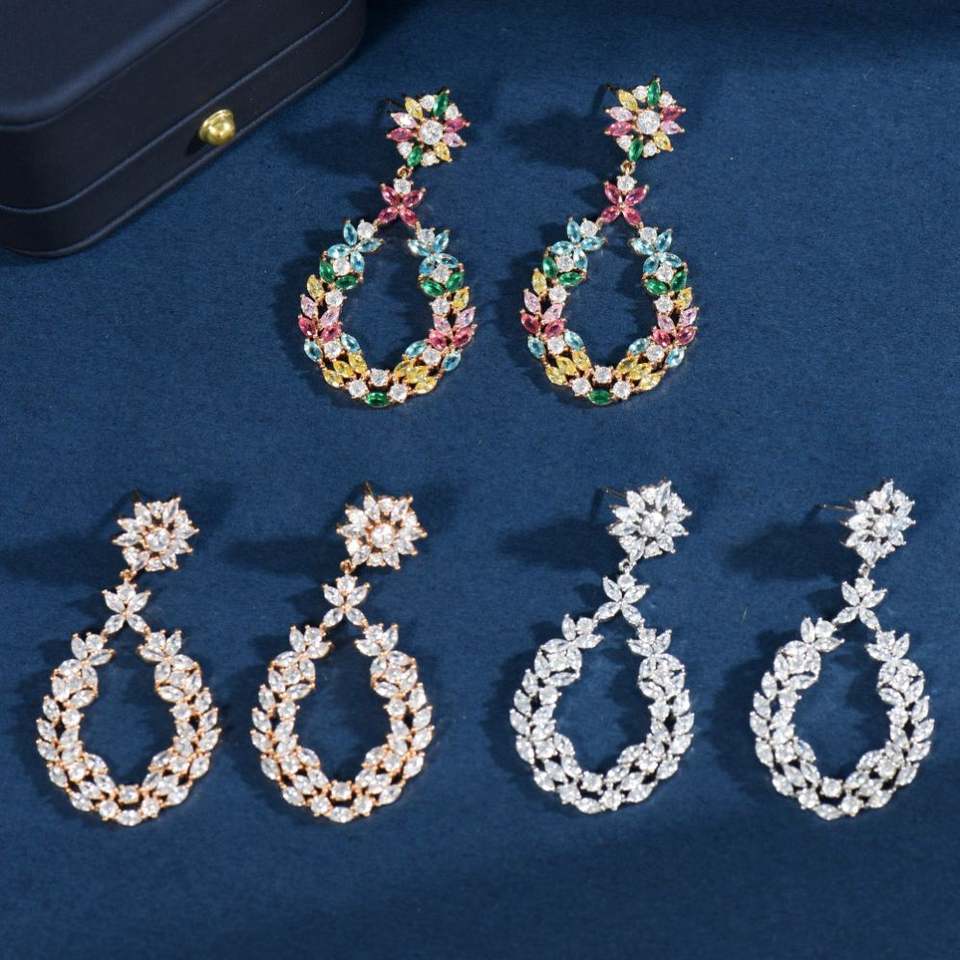 HIBRIDE Multicolor Flower Shape Cubic Zirconia Big Crystal Drop Bridal Long Earrings for Wedding Brides Accessories E-1104