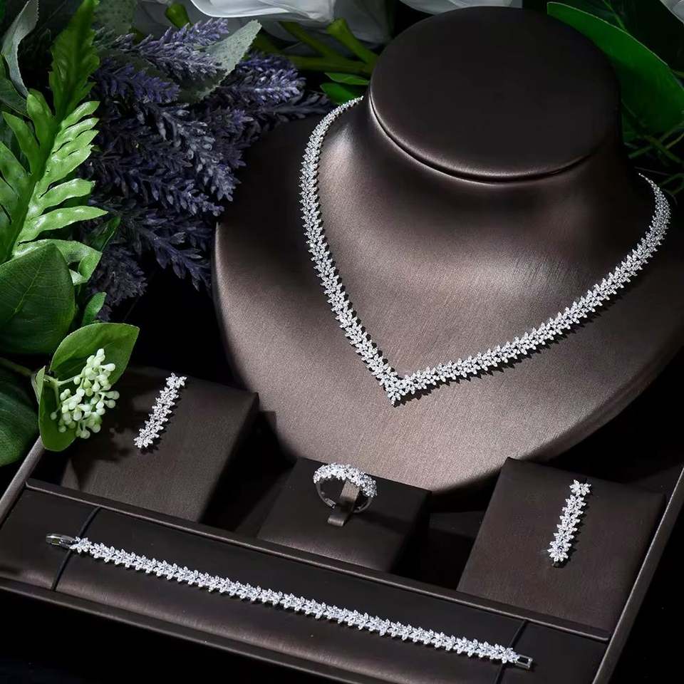 HIBRIDE Simple Cubic Zircon 4pcs Earring Set Leaf Shape Chain Bridal Set for Women Wedding Party African Beads Jewelry Set N-248