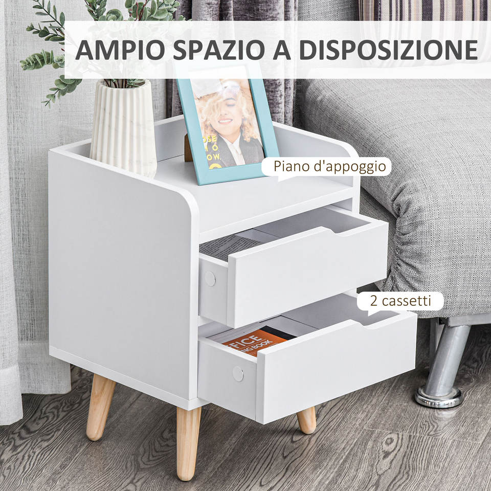 HOMCOM Space-Saving Bedside Table with Modern Design in White Wood, Small Bedroom Chest of Drawers with 2 Drawers and Pine Wood