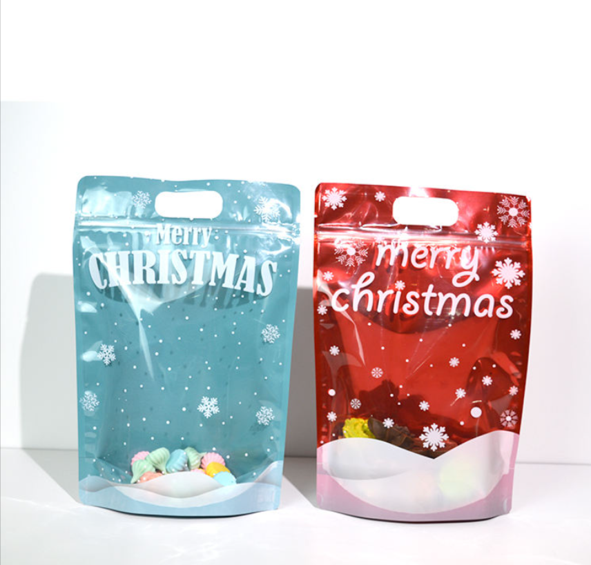 HOT SELLER Resealable Laminated Packaging for Christmas Snacks Zipper Bags Soft Touch Stand up Pouches With Portable Handle