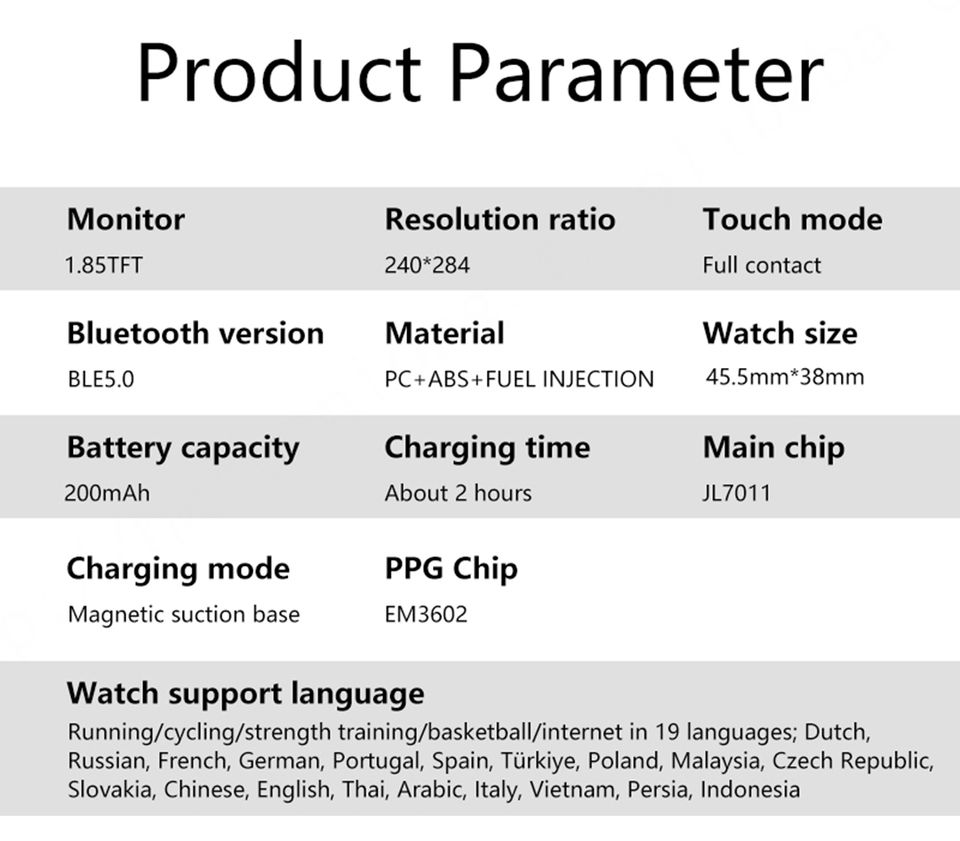 Calendar, Alarm Clock, Remote Control, Sleep Tracker, Speed Measurement, Fitness Tracker, Passometer, Call Reminder, Answer Call, Push Message, Mood Tracker, Altitude Meter, Heart Rate Tracker, WORLD TIME, Calculators